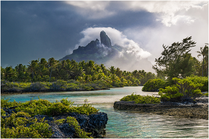 The iconic peak of Otemanu is the highpoint of Bora Bora at 2,385 ft. Storm clouds hovering around the peak produced the spectacular lighting.